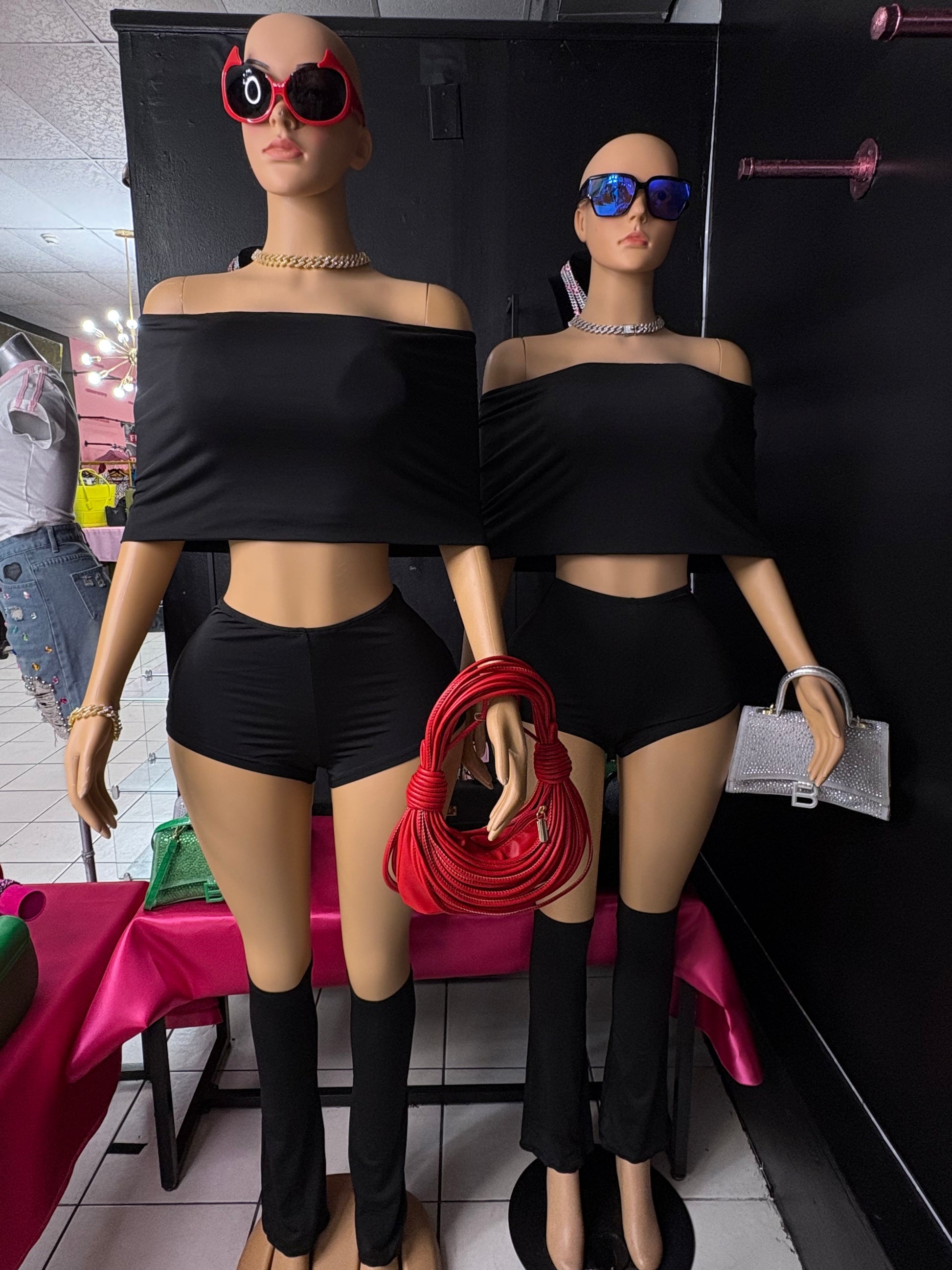 Make a statement in Our BOLD MOVE SHORTS SET. This daring three-piece combines an off-shoulder ruched crop top, curve-hugging shorts, and coordinating knee-high leggings for a look that’s ahead of the trend. Sleek, sultry, and fashion-forward, this set is made for women who aren’t afraid to stand out.