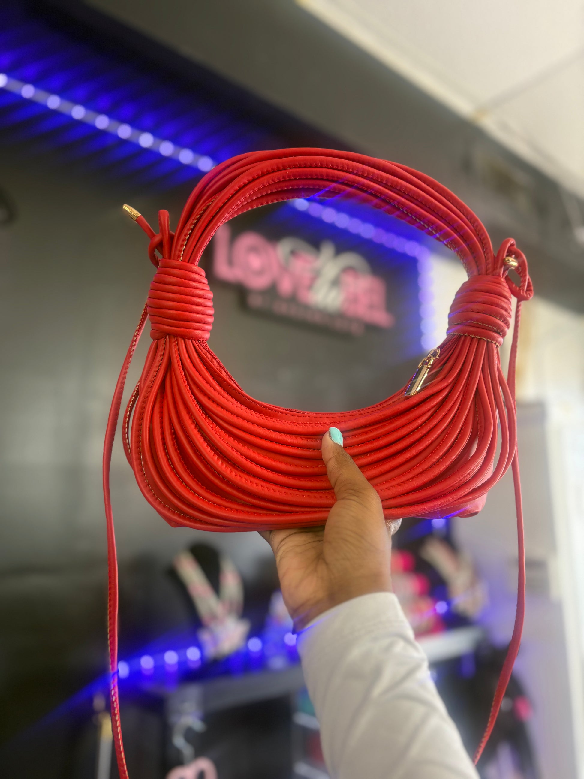 Turn every entrance into a statement with The Crimson Twist Bag. Designed in bold red with eye-catching rope-style detailing and luxe gold hardware, this bag brings modern edge with a sculptural twist. It comes with a removable strap so you can wear it as a chic shoulder bag or style it handheld for that fashion-forward finish. Compact yet roomy enough for your daily must-haves, this bag is the pop of power your outfit’s been waiting for.