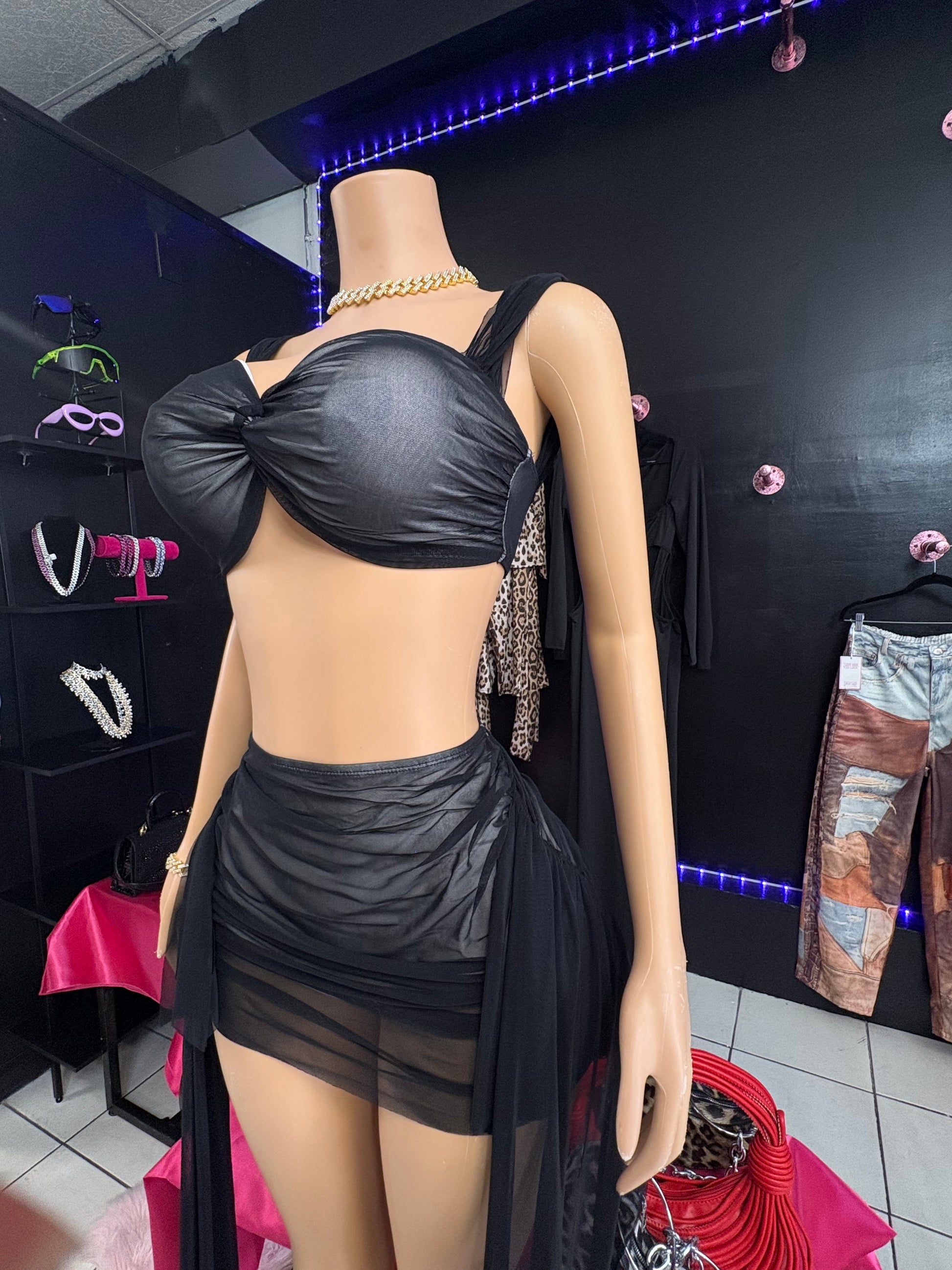 Bring the heat with the DARK DESIRE SKIRT SET. Designed for nights that call for bold confidence, this two-piece set features a twisted crop top with off-the-shoulder draping and a sheer, high-slit skirt overlay that moves with you. The mesh detailing and sultry cut show just enough skin to make a lasting impression.