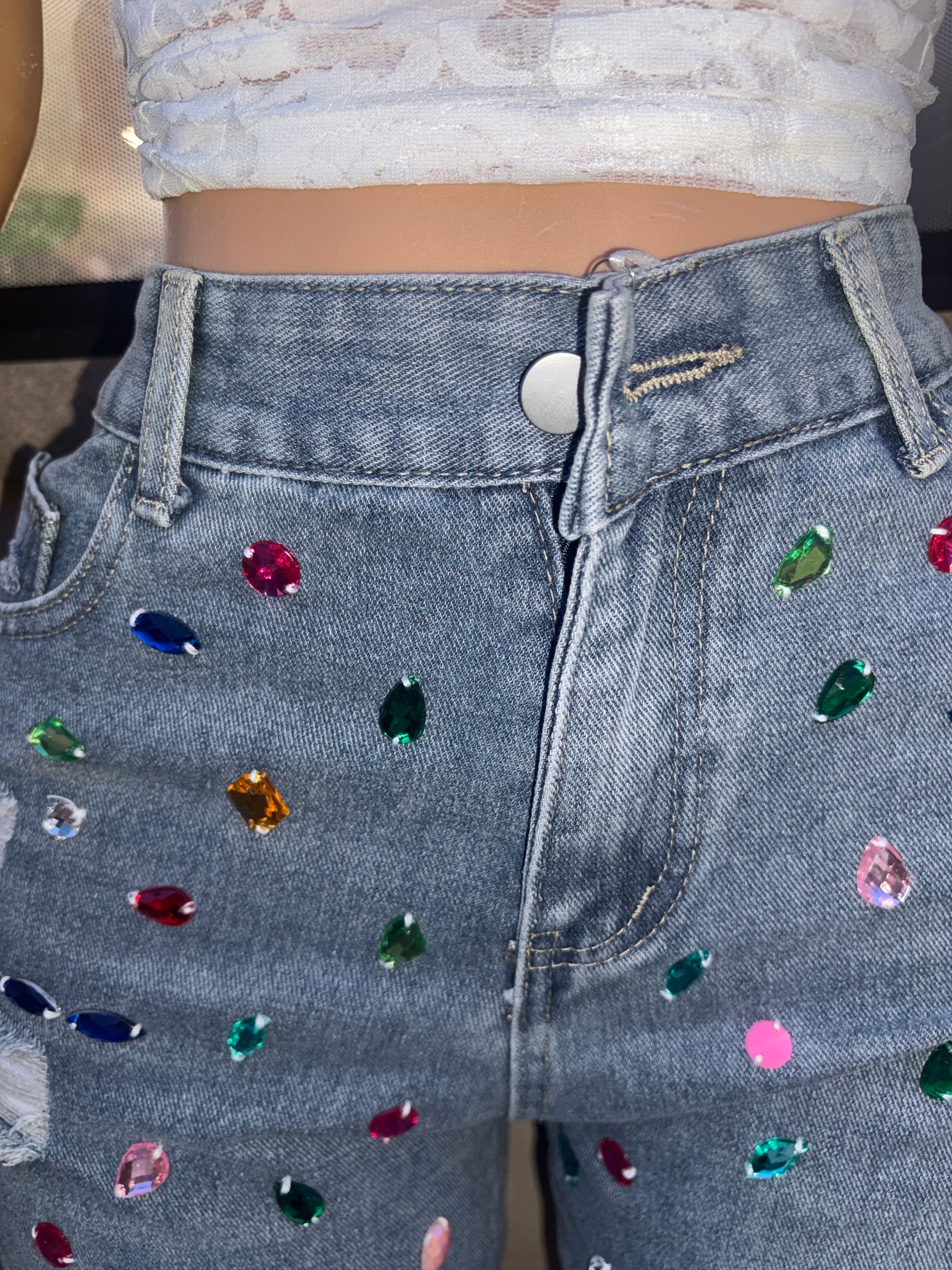 Crafted with a colorful jem design, the Pretty Statement Jean Shorts add a creative and unique touch to your wardrobe. Stand out in style with these expertly crafted shorts, perfect for any occasion.
