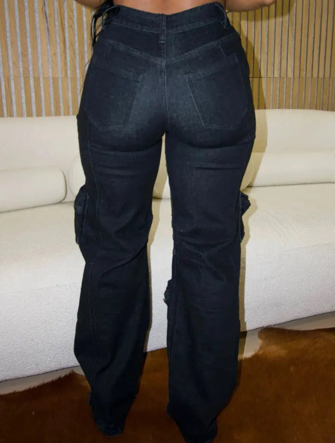 Make a statement with our elegant and exclusive SOME'THING TO TALK ABOUT DEMIN JEANS. These quality stitch demin jeans feature a luxurious Ash wash blue color and two high thigh cut outs adorned with sparkling gems. With its wide cargo style and strap detailing at the bottom, these jeans are the epitome of fashion-forward style. A must-have for any wardrobe.