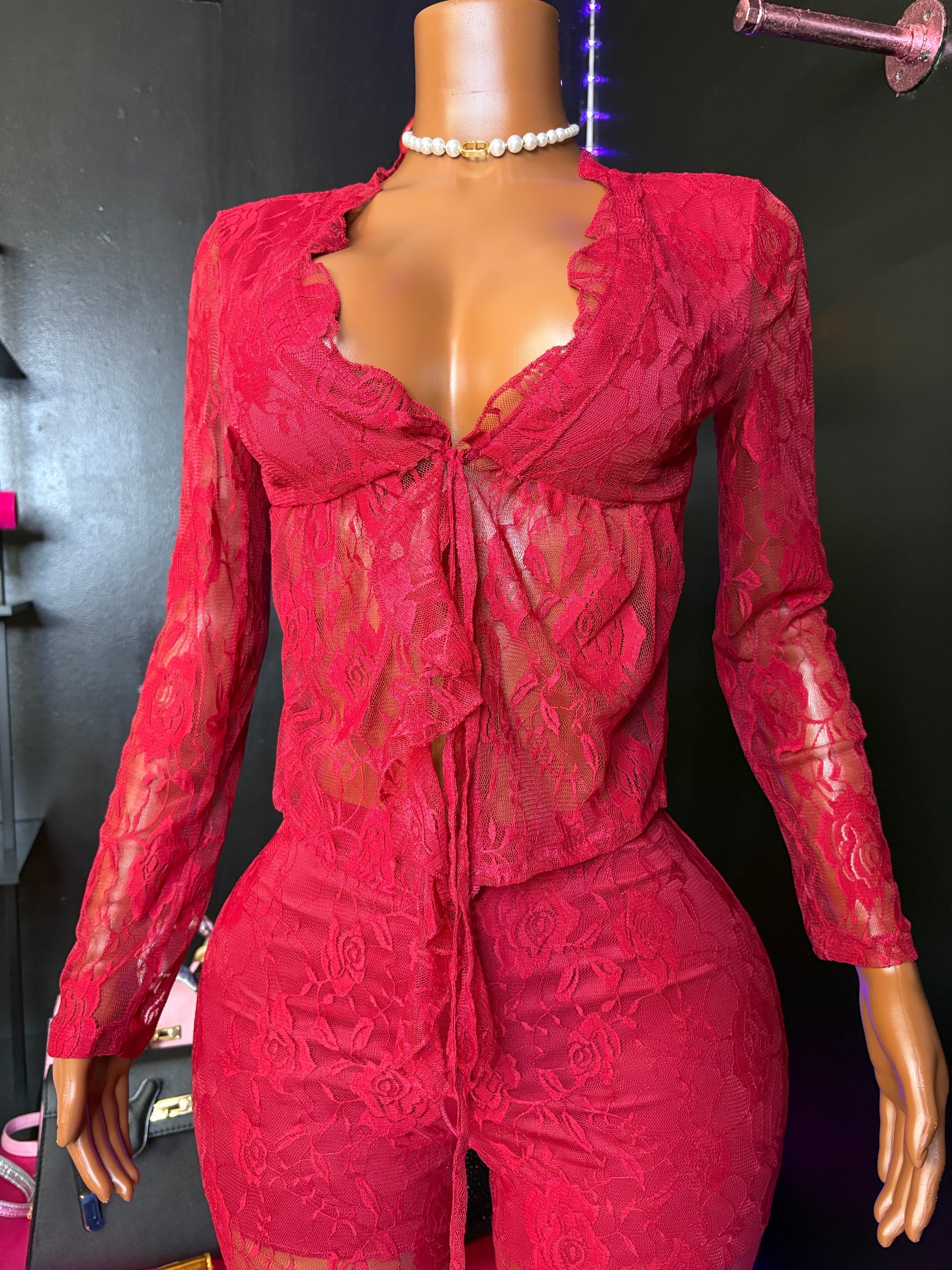 Step into seduction with the Carmilla Set. Crafted in fiery red lace, this two-piece is equal parts daring and refined. The long-sleeve tie-front top pairs seamlessly with high-waisted lace flare pants, creating a dramatic silhouette that’s bold yet elegant. Designed for women who own every room they walk into, this set is romantic, unforgettable, and unapologetically powerful.